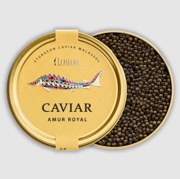 Wyjątkowo gruboziarnisty i delikatny kawior z jesiotra Amur Royal charakteryzuje się pełnym i zrównoważonym smakiem, który zachwyca smakoszy na całym świecie. Otulone pięknym, ciemnym połyskiem, każde z ziaren ma imponującą średnicę od trzech do czterech milimetrów. To stawia Amur Royal na równi z pożądanym kawiorem z bieługi. Jego charakterystyczny, ciemnobursztynowy kolor i subtelny aromat świadczą również o jego wyjątkowej szlachetności.