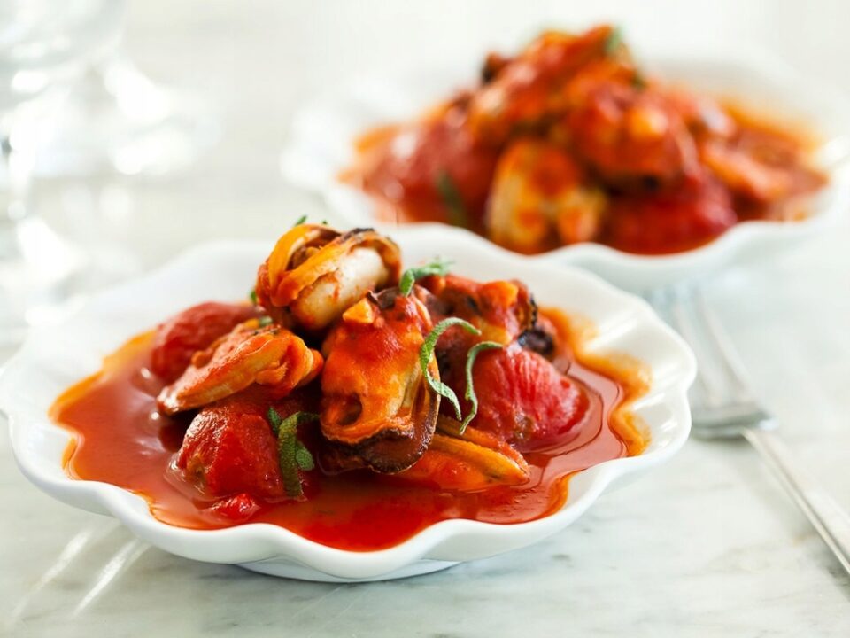 Małże w sosie pomidorowym. Konserwa sterylizowana, gotowa do spożycia.